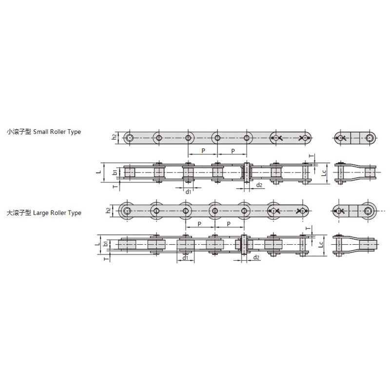 • Увеличенный шаг:Шаг в два раза больше, чем у стандартных цепей, что улучшает распределение нагрузки и продлевает срок службы цепи.